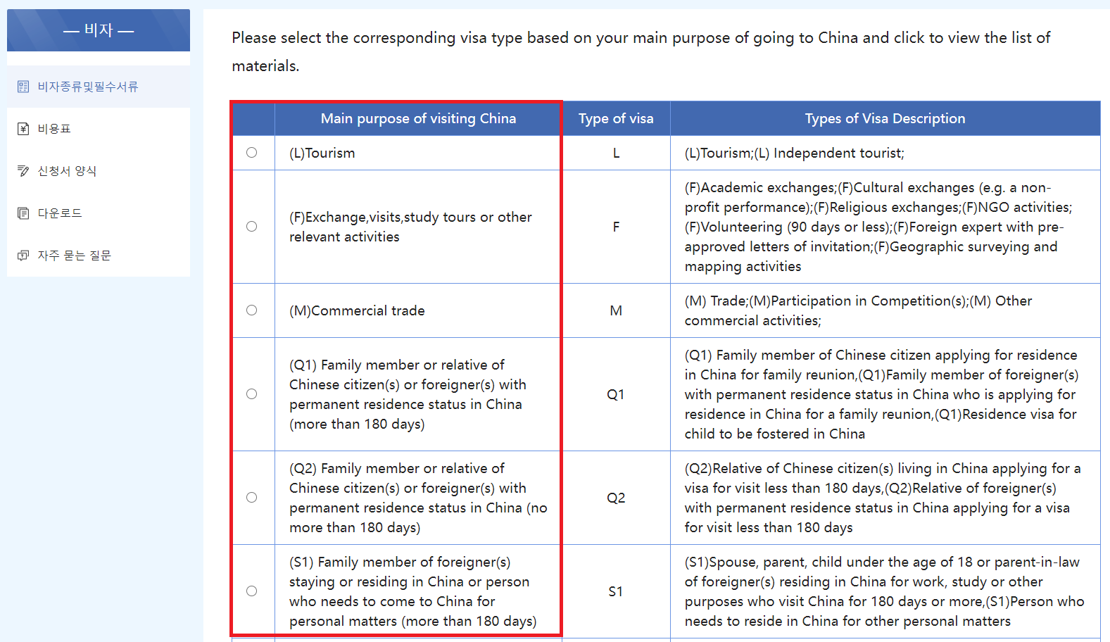 - 위 페이지에 접속하셔서 중국비자 신청 목적을 선택해주세요.