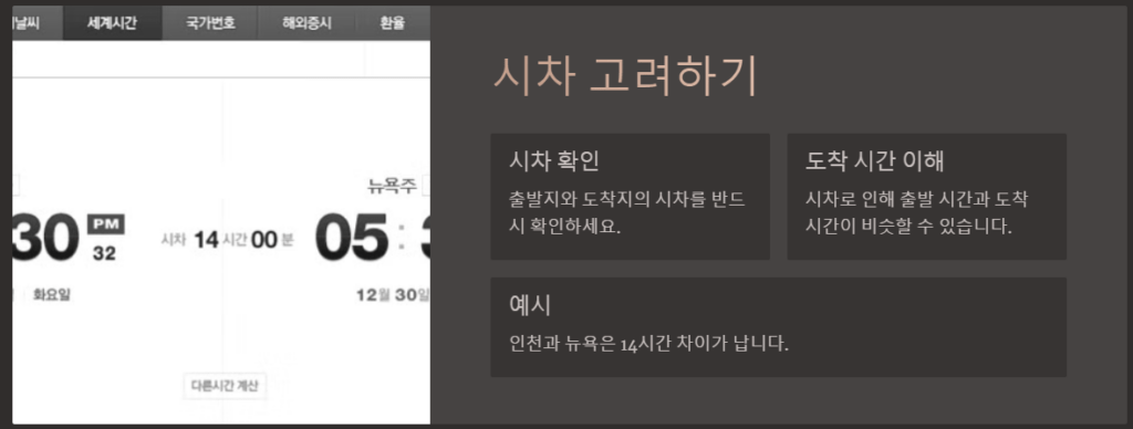 많은 분들이 혼란스러워하는 부분이 바로 시차 때문에 발생하는 출발과 도착 시간의 차이입니다. 예를 들어, 인천에서 뉴욕으로 가는 항공편의 경우를 살펴보겠습니다.