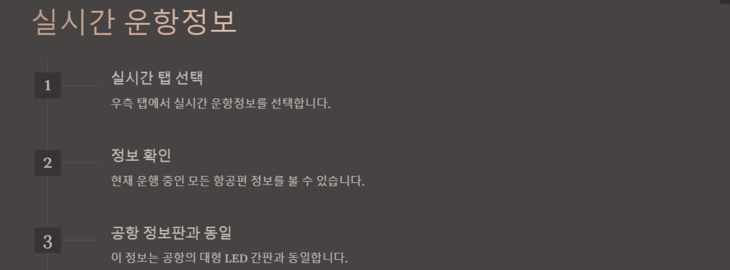 대한항공 출도착 조회 페이지의 우측 탭에서는 실시간 운항정보도 확인할 수 있습니다. 이 정보는 공항의 대형 전광판에 표시되는 정보와 동일한 것으로, 현재 운항 중인 모든 항공편의 상태를 실시간으로 보여줍니다.